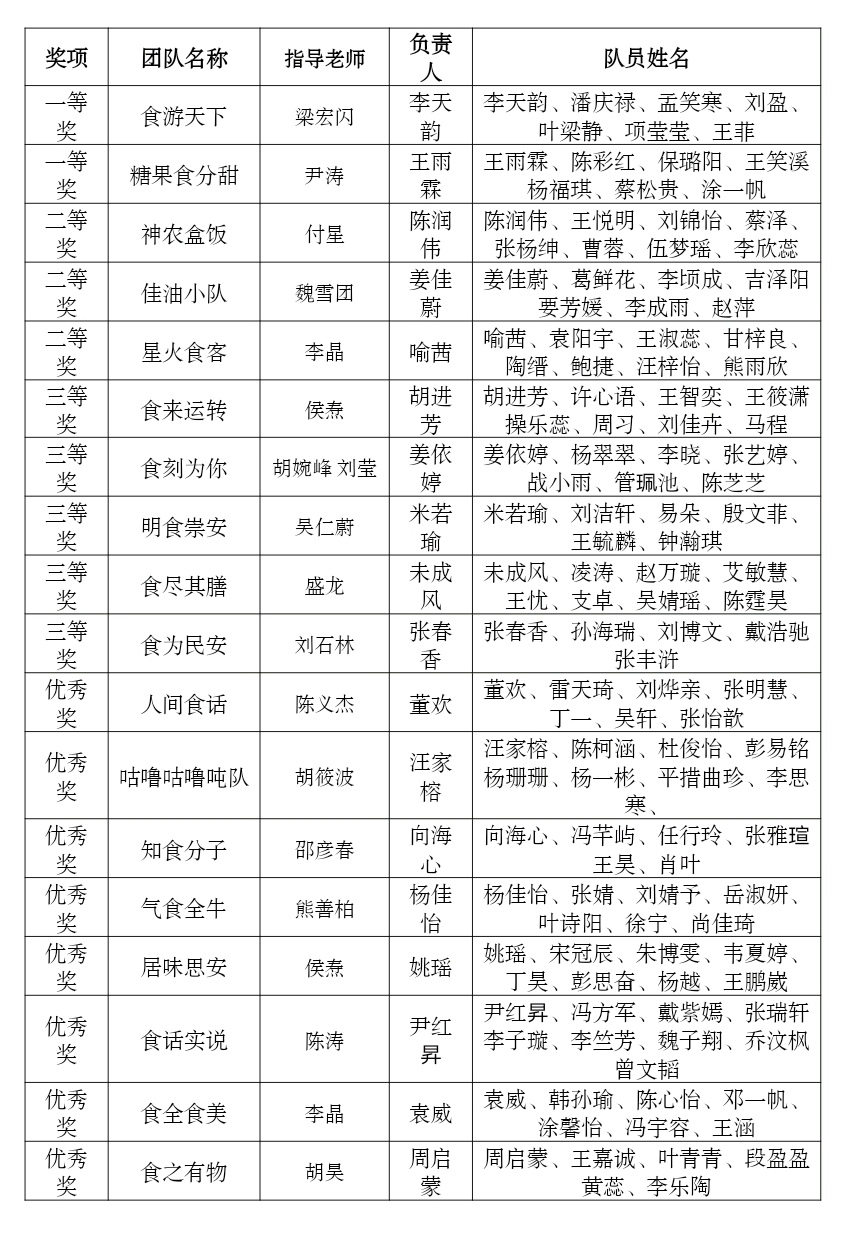 为深入贯彻党的十九大、五中六中全会精神,认真落实中共中央国务院《关于深化改革加强食品安全工作的意见》,根据《2021年“食品安全与营养中国行”知识宣讲大赛比赛规则》评选方法,经团队宣讲与新闻稿撰写,综合宣讲得分、新闻稿得分,评选出一、二、三等奖、优秀奖共十八支队伍,以下为获奖队伍名单: