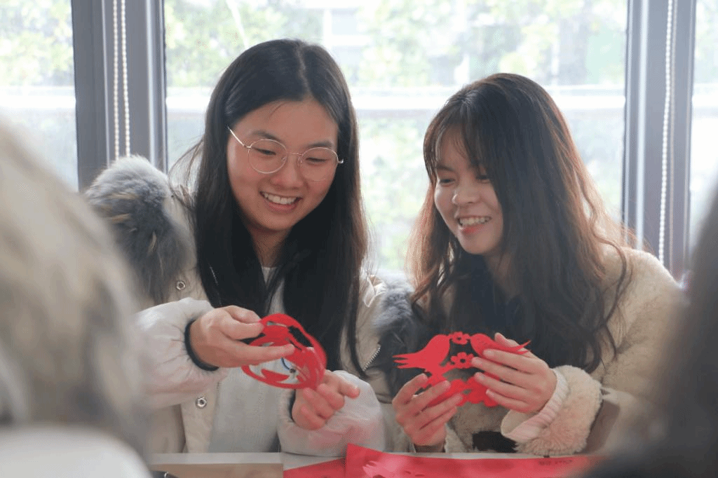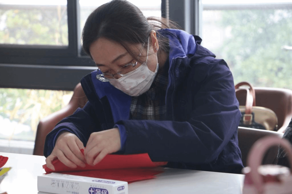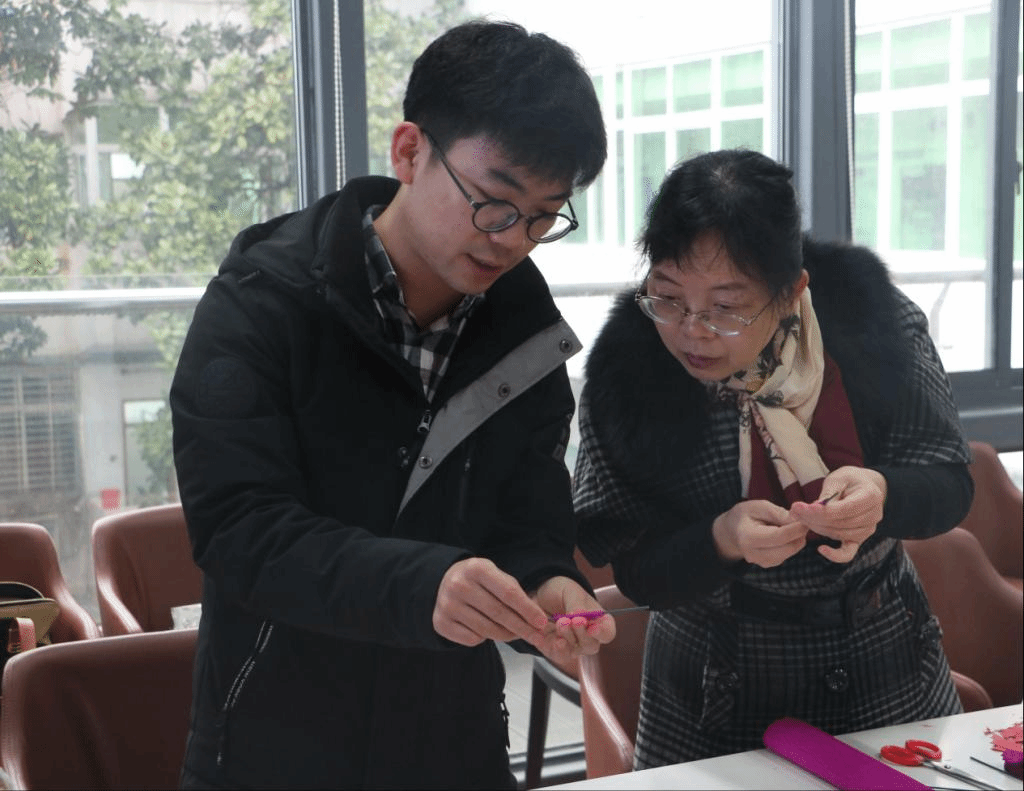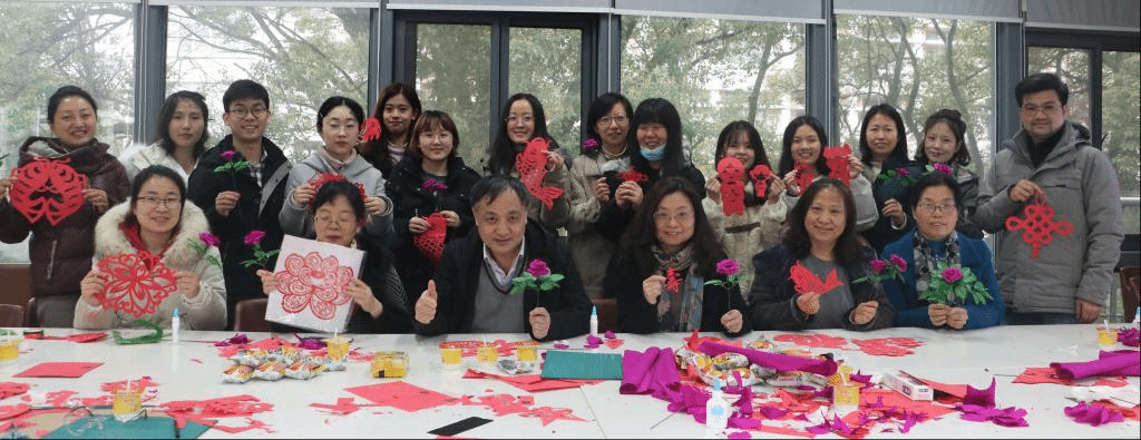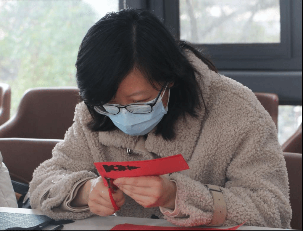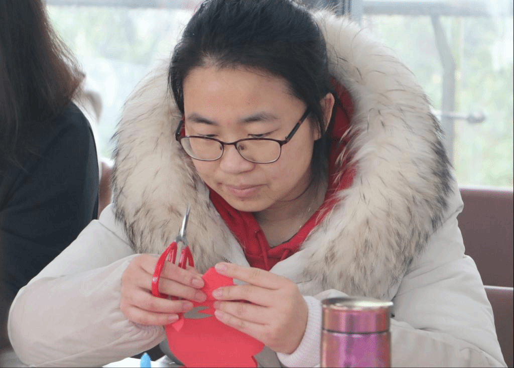 “今天我剪了好多窗花,这个锦鲤剪得最为精致,打算贴在办公室的窗户上,希望能好运相伴呀!”鲁群老师和袁方老师和老师们分享道自己的作品。“听说学院最近有老师好事将近,特意给老师们剪了几个红双喜,美好的祝福要送给他们”荣建华老师开心的说道。“愿每一位美丽的老师都能笑靥如花,永远18岁”,园林学院的晏智同学一边娴熟的制作玫瑰花一边笑着说道。