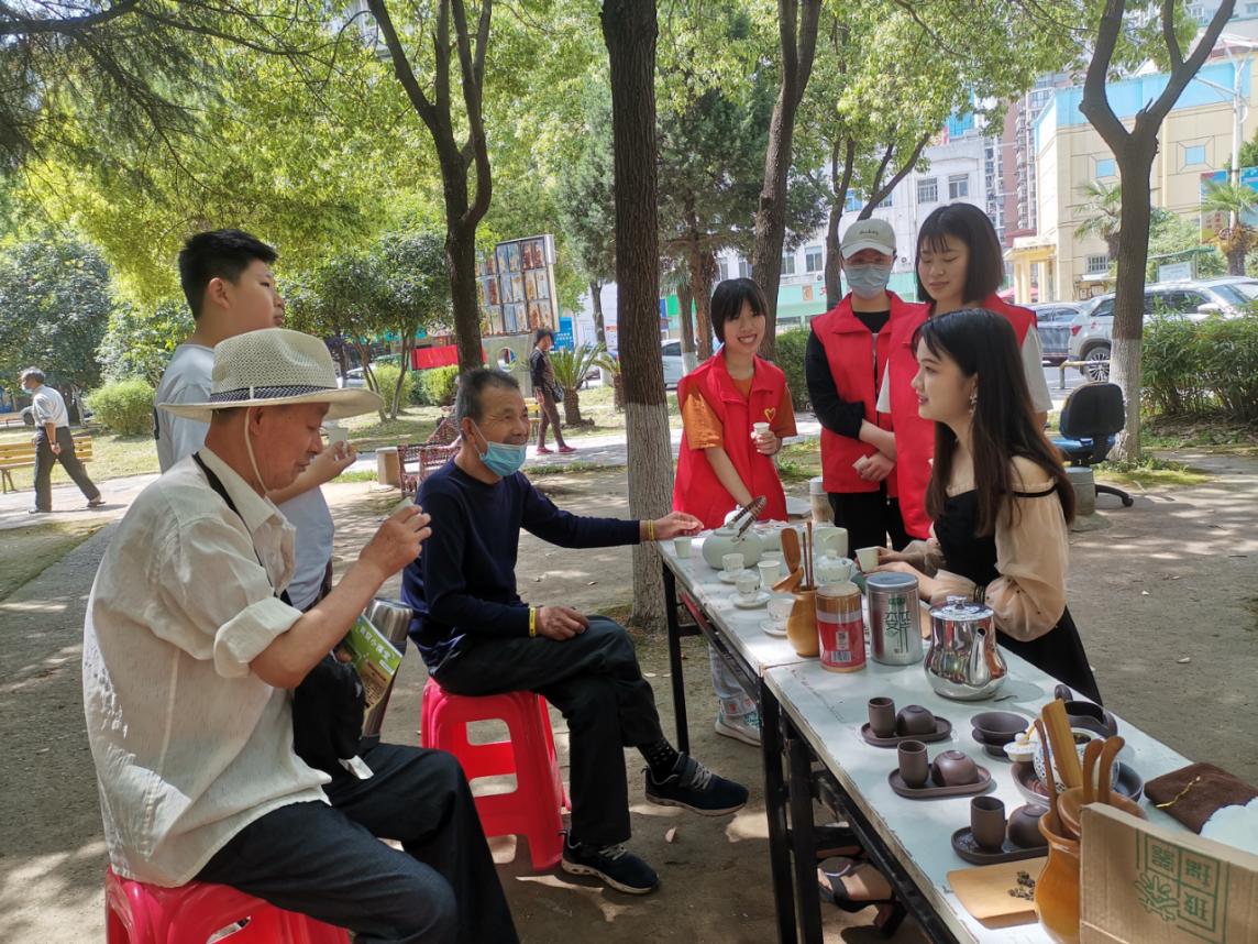 5月1日,服务队联合茶协会的志愿者在社区内通过茶艺展示向居民们讲解泡茶流程、茶文化中具有古风的名词以及选茶的方法。通过志愿者们的讲解,居民们更好地了解了我国博大精深的茶文化与源远流长的饮茶史,对不同品种的茶叶也有了一定的认识与区分。